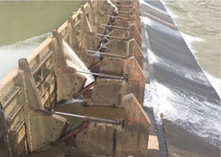 翻板壩阻水,經(jīng)不住洪水的沖擊,易被漂浮物卡塞或上游淤積造成不能自動(dòng)翻板,容易被洪水沖壞壩體影響防洪安全。洪水過后翻板門再關(guān)上時(shí)被異物卡住,造成大量漏水,一旦淤積厚度較大或泥沙板結(jié),閘門就不能正?;亻T(眾多閘門中只要有一扇),將影響河道正常蓄水。汛期漂浮物(特別是樹枝)經(jīng)常卡住閘門導(dǎo)致起翻或回落困難,威脅到行洪安全。